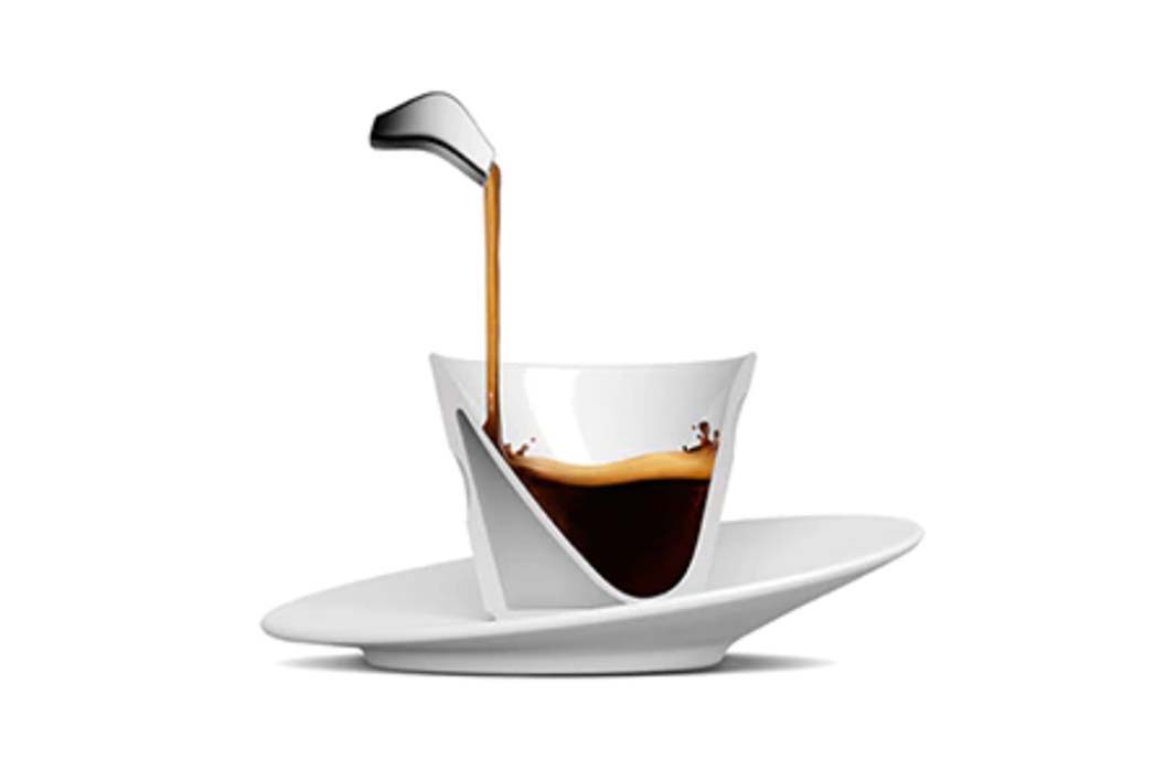 Nach dem gelochten Espoon entwickelte das Team des Training Centers in Zusammenarbeit mit Davide Oldani die Ecup: eine schlichte, elegante Tasse, bei der eine der beiden Innenseiten auf markante Weise geneigt ist. Dadurch kann der Espresso aus der Maschine sanft in die Tasse fließen. Sie verfügt über eine besondere Luftkammer, die den Kaffee isoliert und vor Verbrennungen schützt. Zwei kleine Vertiefungen an der Seite der Tasse sorgen für mehr Griffigkeit. Mit der Ecup fließt der Espresso langsam in die Tasse, ohne die Crema zu zerstören. Der Geschmack und das Aroma bleiben in vollem Umfang erhalten.